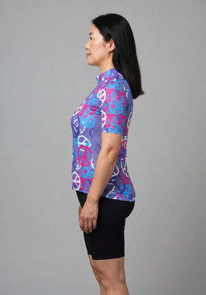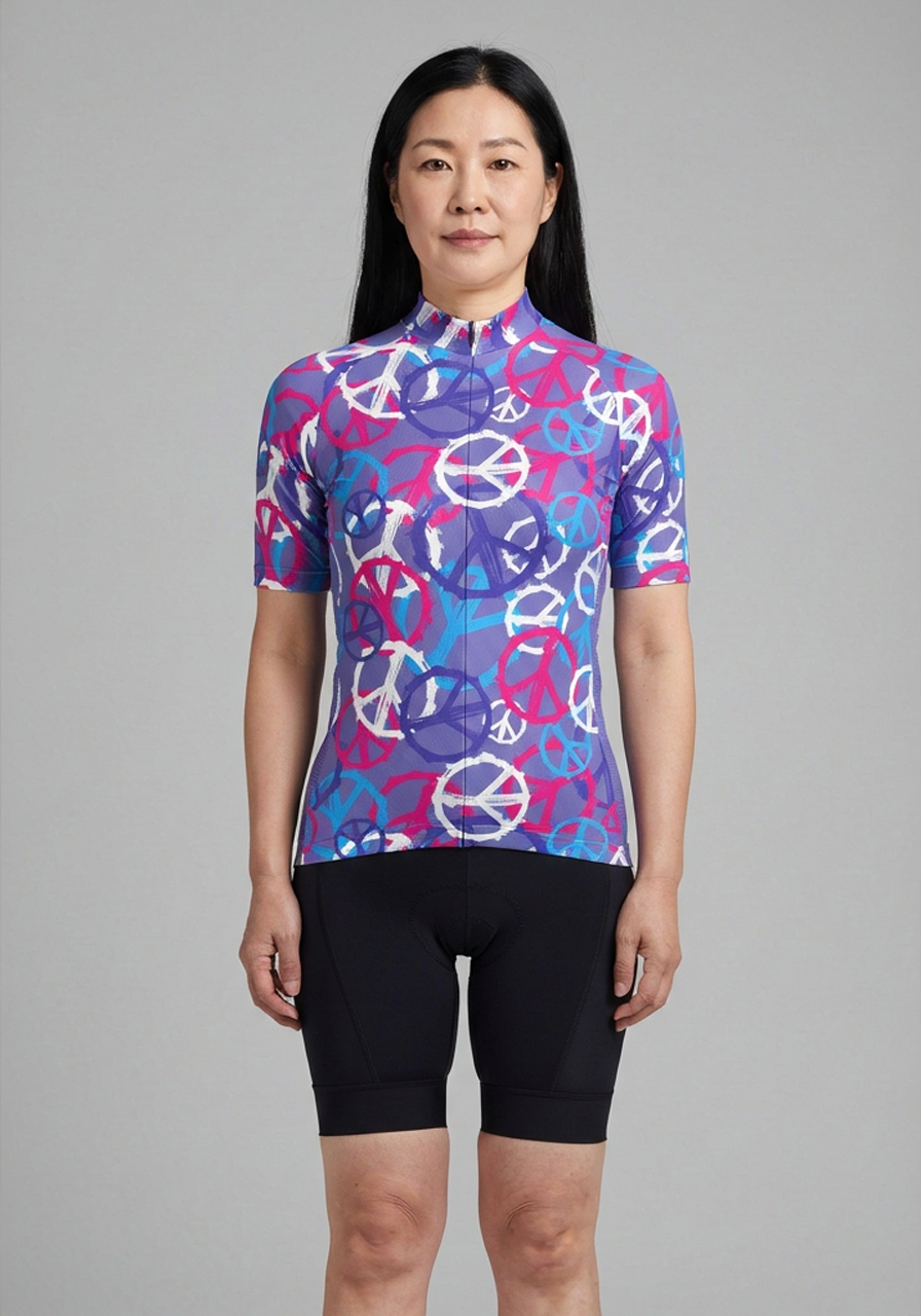 تفاصيل قميص ركوب الدراجات بأكمام قصيرة باللون الأرجواني والسلام للنساء