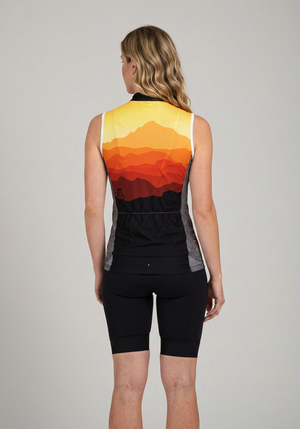يتميز قميص ركوب الدراجات بلا أكمام بتصميم غروب الشمس للنساء بنسيج بوليستر LEMBO 140 جرام يمتص الرطوبة، ولوحات جانبية من نسيج شبكي بوليستر 110 جرام للتبريد، وجيوب خلفية معززة بالتطريز.