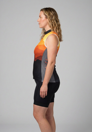 OCG و OCG Originals قد اجتمعتا لتقديم قميص ركوب الدراجات بلا أكمام بتصميم غروب الشمس للنساء حتى تتمكني من الظهور بأناقة في رحلتك القادمة وتشعري براحة القميص المصمم بقصة نسائية.