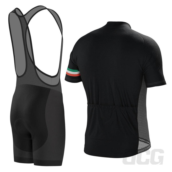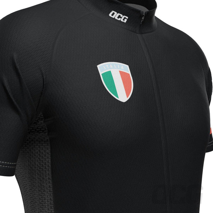 The Men's Classic Italia Short Sleeve Cycling Kit features a moisture-wicking LEMBO 140 GSM polyester jersey body, cooling 110GSM mesh side panels, and reinforced stitched back pockets.
