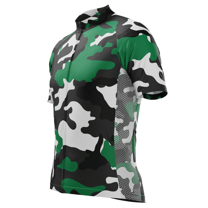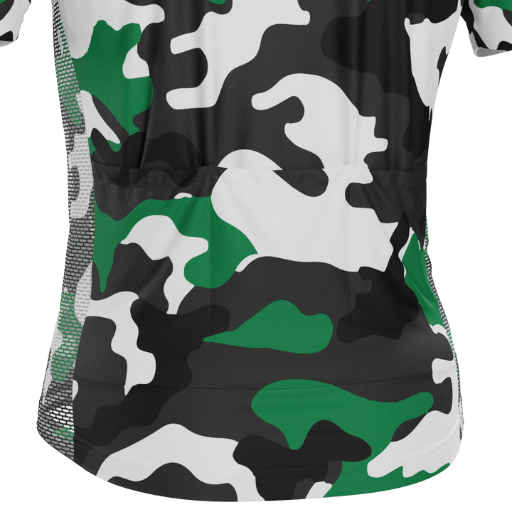 The Men's Camouflage Winter Green Short Sleeve Cycling Jersey features a moisture-wicking LEMBO 140 GSM polyester, cooling 110GSM mesh side panels, and reinforced stitched back pockets.