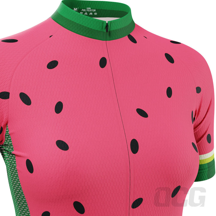 The Women's Watermelon Fruit Short Sleeve Cycling Jersey features a moisture-wicking LEMBO 140 GSM polyester, cooling 110GSM mesh side panels, and reinforced stitched back pockets.