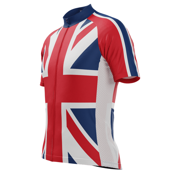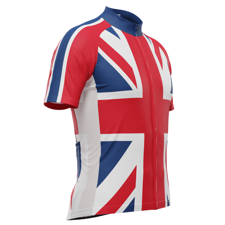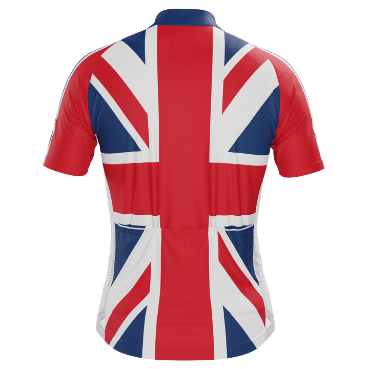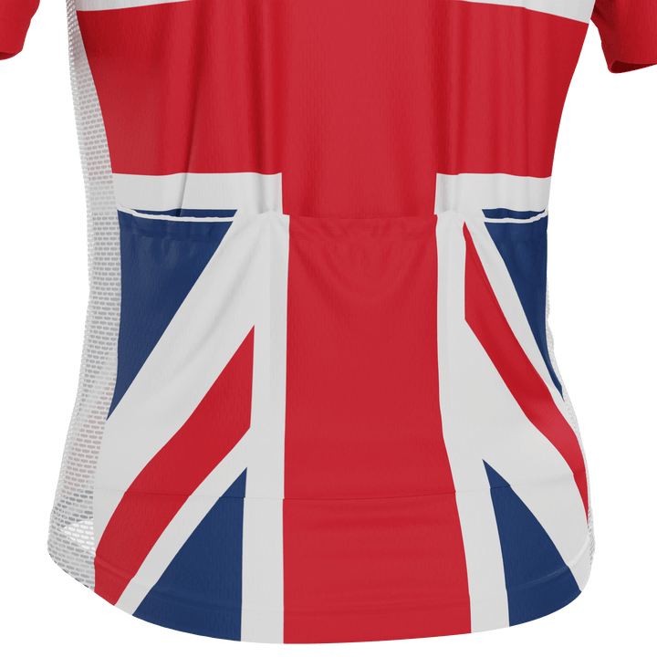 The Men's Union Jack UK Short Sleeve Cycling Jersey features a moisture-wicking LEMBO 140 GSM polyester, cooling 110GSM mesh side panels, and reinforced stitched back pockets.