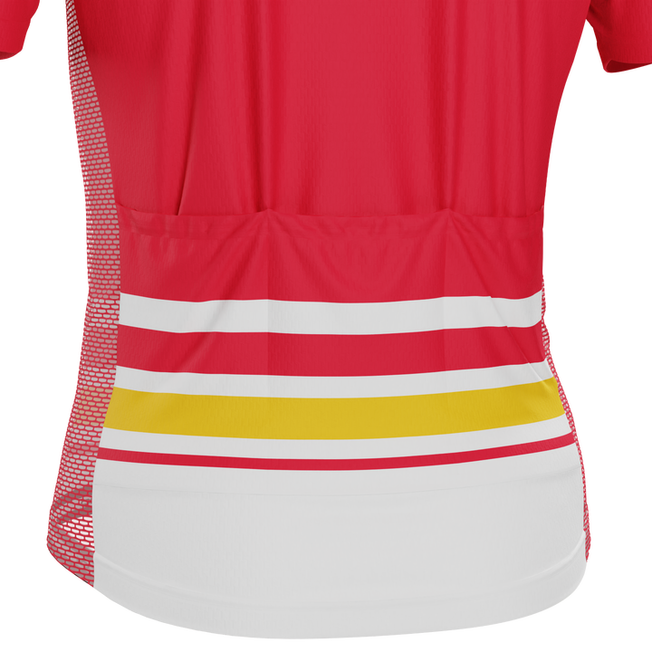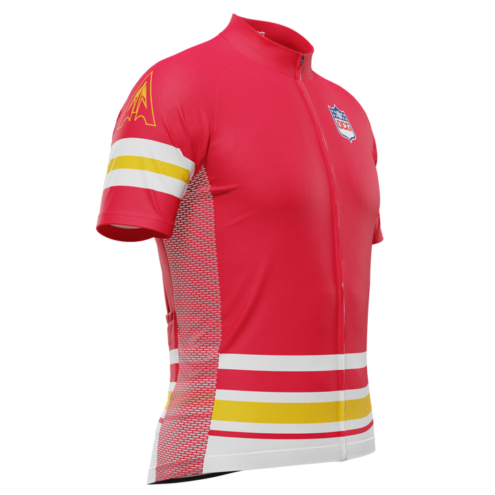 The Men's Kansas Football Short Sleeve Cycling Jersey features a moisture-wicking LEMBO 140 GSM polyester, cooling 110GSM mesh side panels, and reinforced stitched back pockets.