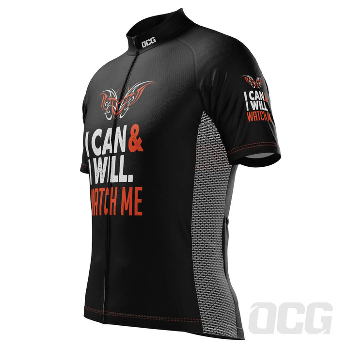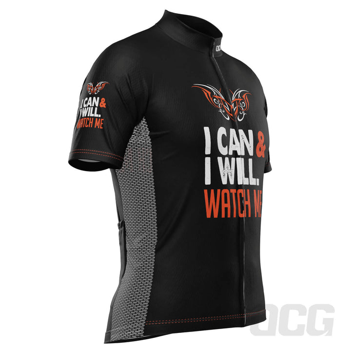 The Men's I Can I Will Watch Me Short Sleeve Cycling Jersey features a moisture-wicking LEMBO 140 GSM polyester, cooling 110GSM mesh side panels, and reinforced stitched back pockets.