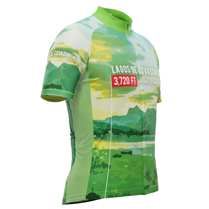 The Men's Lagos de Covadonga Epic Climbs Short Sleeve Cycling Jersey features a moisture-wicking LEMBO 140 GSM polyester, cooling 110GSM mesh side panels, and reinforced stitched back pockets.