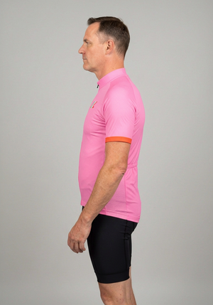 Miesten Pink 100 Giro d'Italia Lyhythihainen Pyöräilypaita sisältää kosteutta siirtävää LEMBO 140 GSM polyesteria, viilentäviä 110GSM verkko-sivupaneeleja ja vahvistettuja ommeltuja takataskuja.