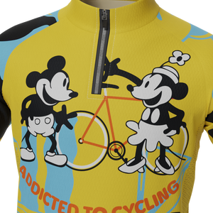 All Steamboat Willie-Addicted to Cycling jerseys feature a quarter-zip to avoid unwanted zipper accidents and allow our mini-cyclists to wear their favorite designs on and off the bike.