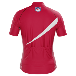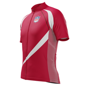 The Men's Arizona Football Short Sleeve Cycling Jersey features a moisture-wicking LEMBO 140 GSM polyester, cooling 110GSM mesh side panels, and reinforced stitched back pockets.