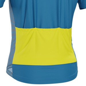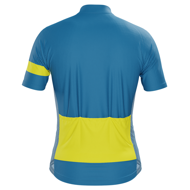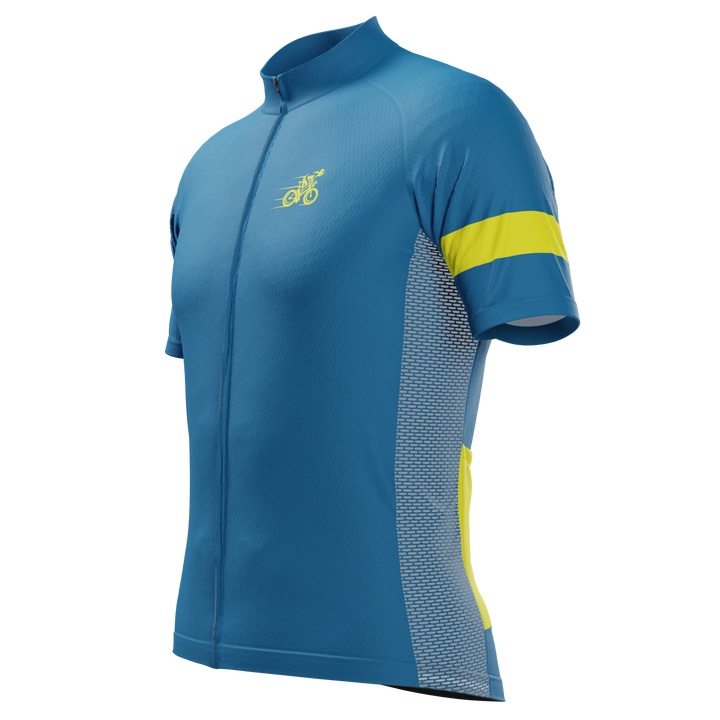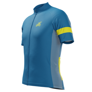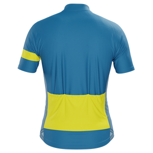 The Men's Armband Short Sleeve Cycling Jersey features a moisture-wicking LEMBO 140 GSM polyester, cooling 110GSM mesh side panels, and reinforced stitched back pockets.