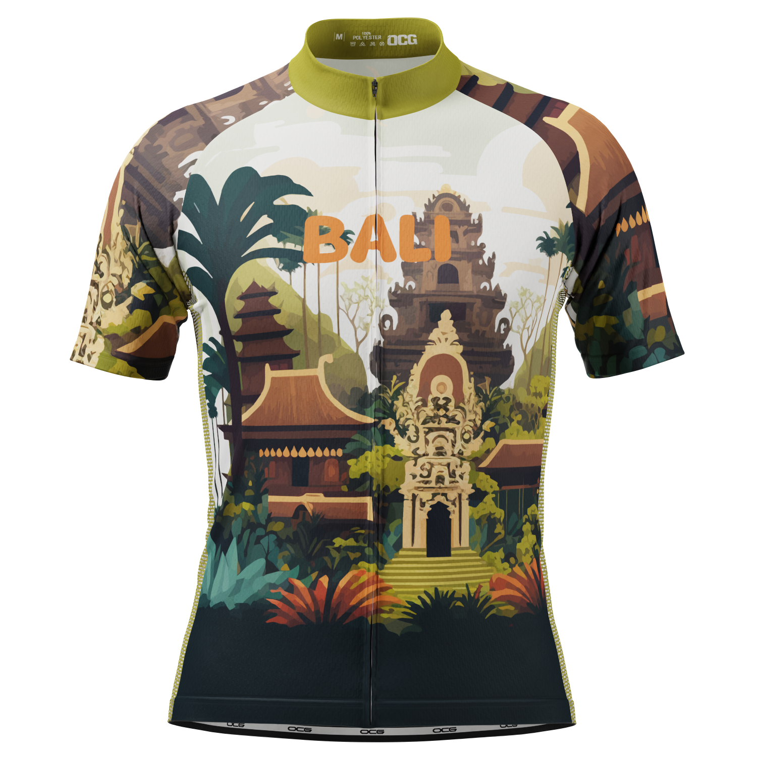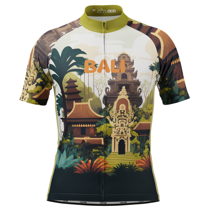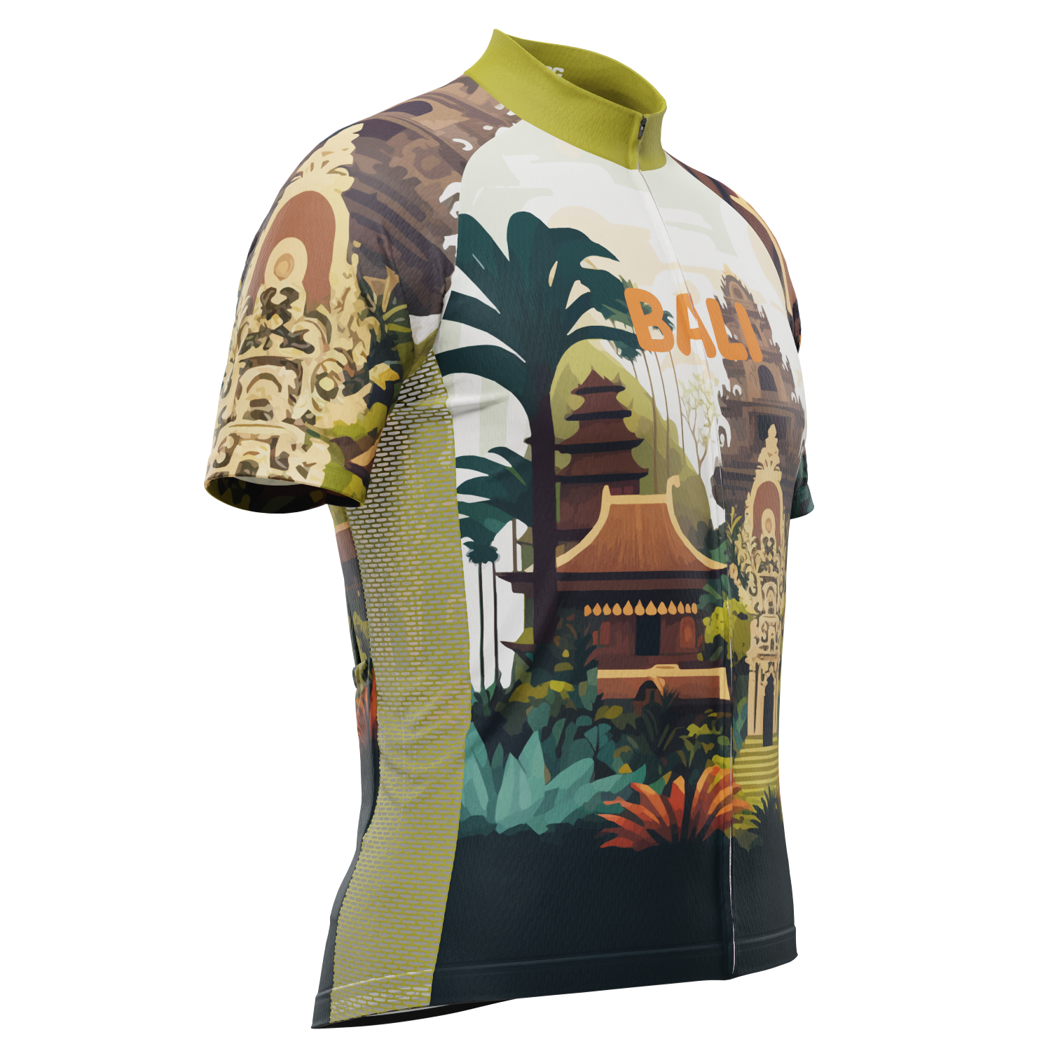 The Men's Around The World - Bali Short Sleeve Cycling Jersey features a moisture-wicking LEMBO 140 GSM polyester, cooling 110GSM mesh side panels, and reinforced stitched back pockets.