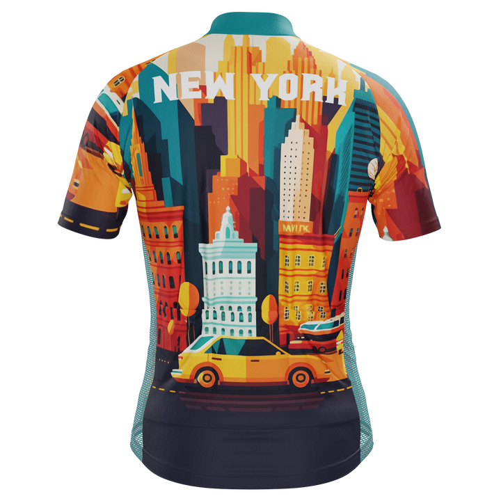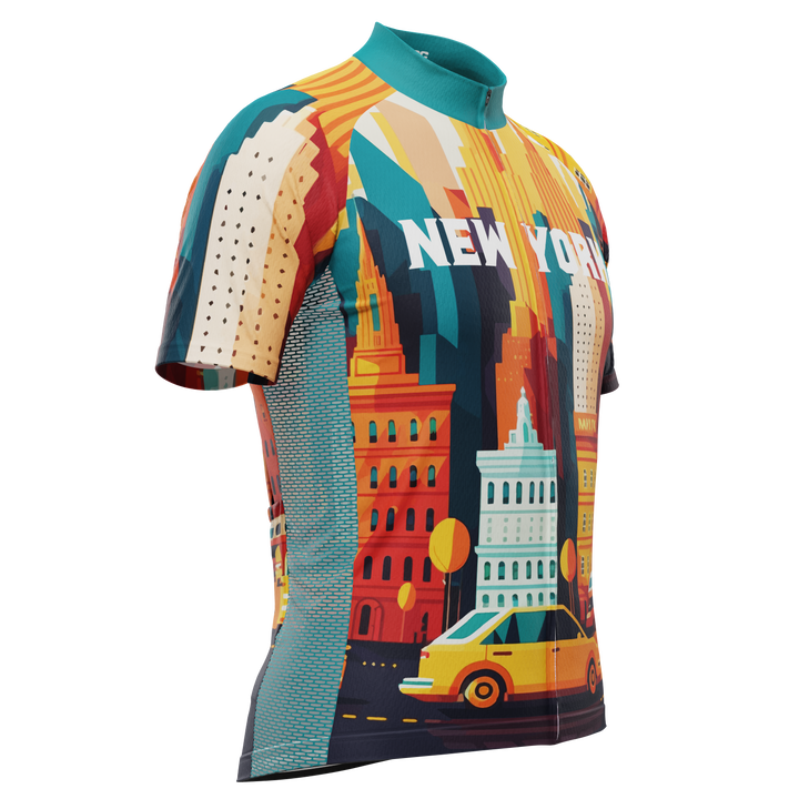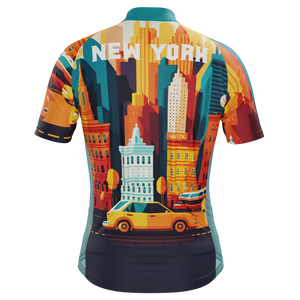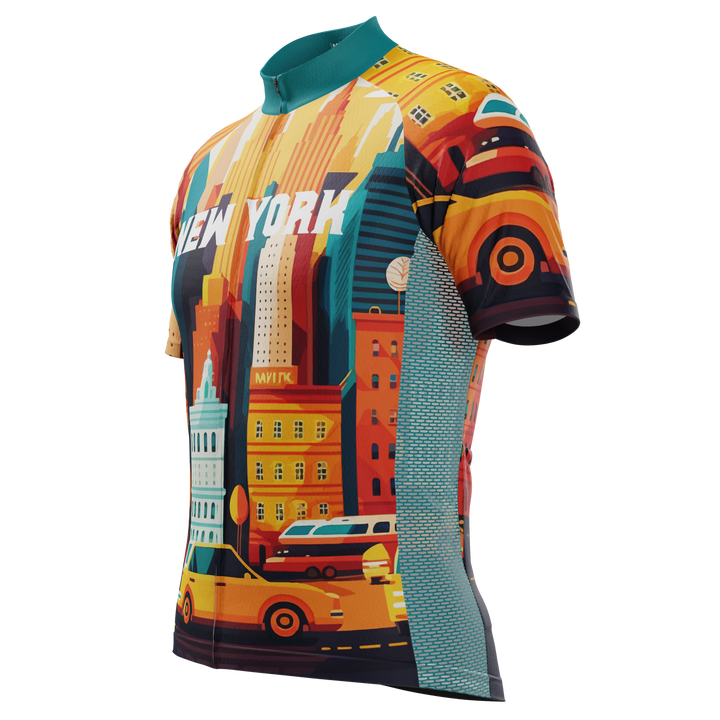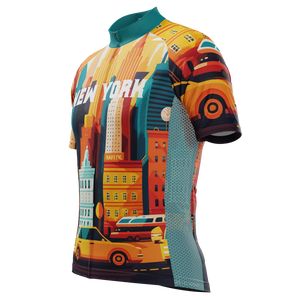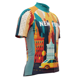 The Men's Around The World - New York Short Sleeve Cycling Jersey features a moisture-wicking LEMBO 140 GSM polyester, cooling 110GSM mesh side panels, and reinforced stitched back pockets.