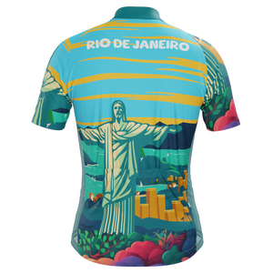 The Men's Around The World - Rio de Janeiro Short Sleeve Cycling Jersey features a moisture-wicking LEMBO 140 GSM polyester, cooling 110GSM mesh side panels, and reinforced stitched back pockets.