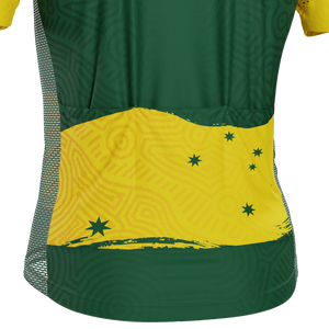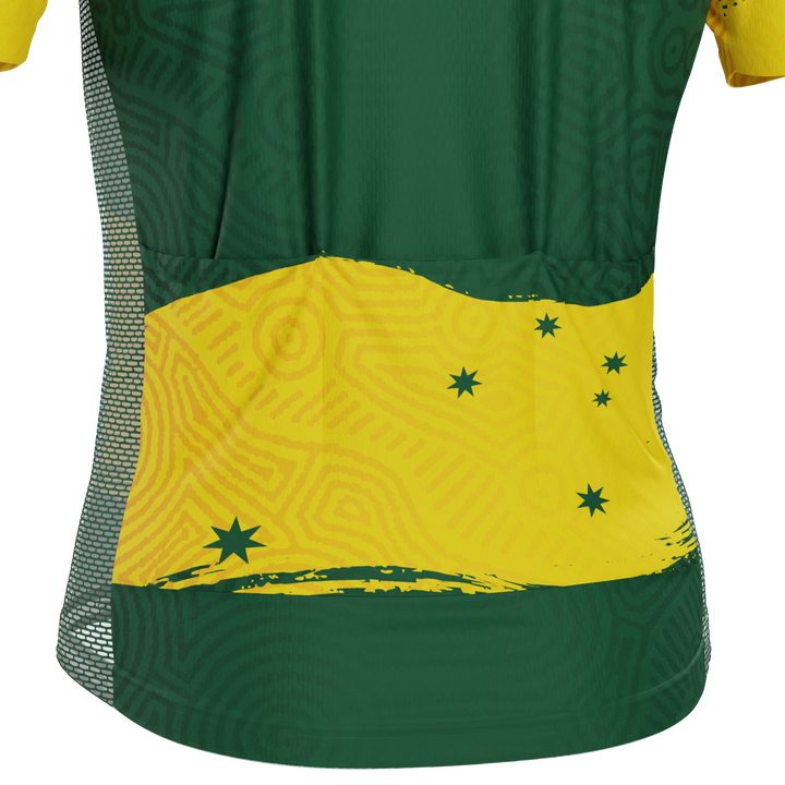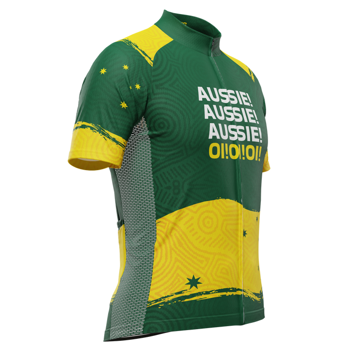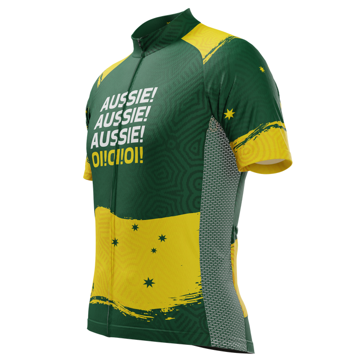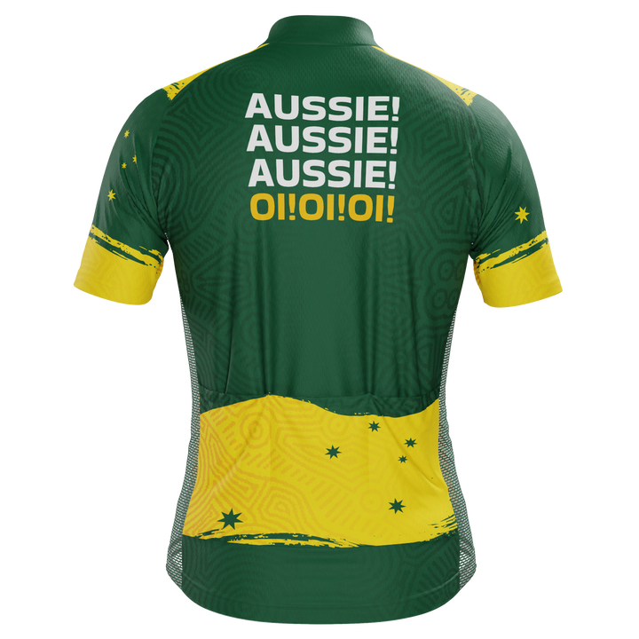 The Men's Aussie Aussie Aussie Short Sleeve Cycling Jersey features a moisture-wicking LEMBO 140 GSM polyester, cooling 110GSM mesh side panels, and reinforced stitched back pockets.