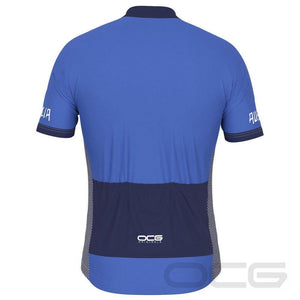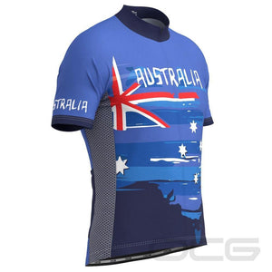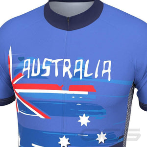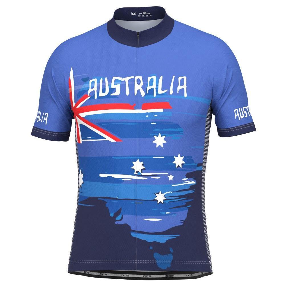 The Men's Australian Flag Short Sleeve Cycling Jersey features a moisture-wicking LEMBO 140 GSM polyester, cooling 110GSM mesh side panels, and reinforced stitched back pockets.