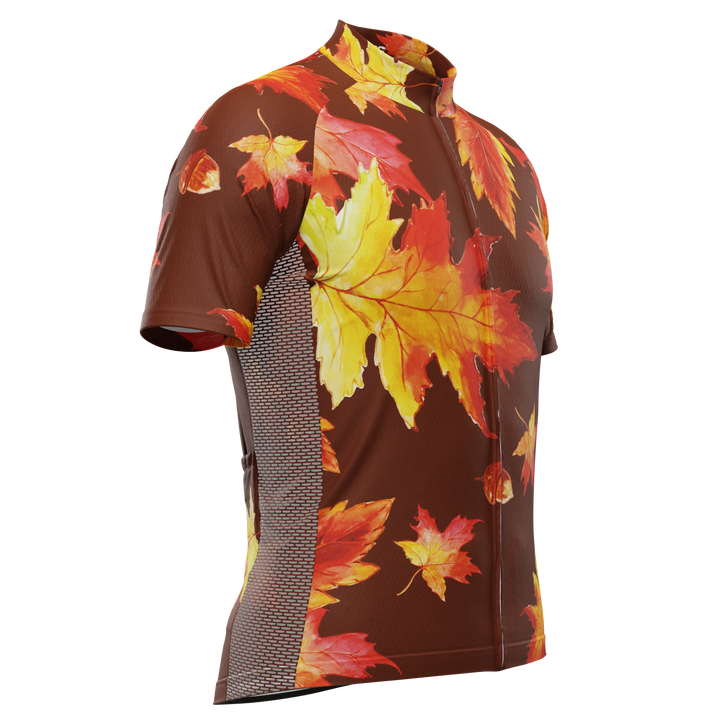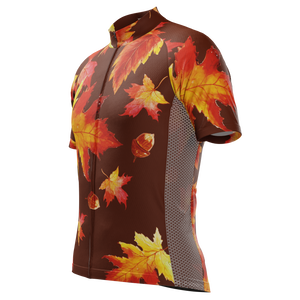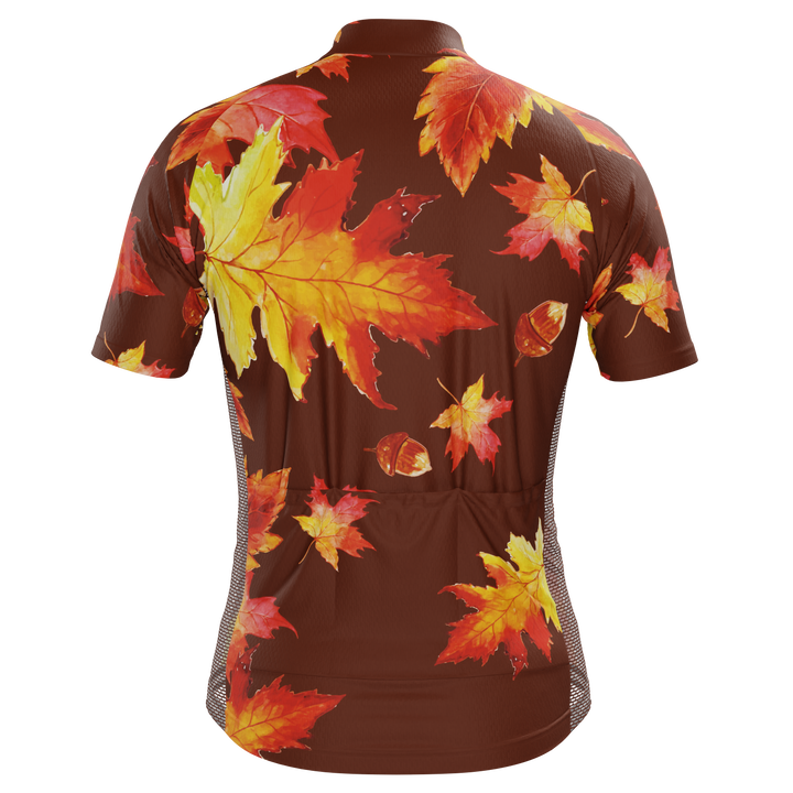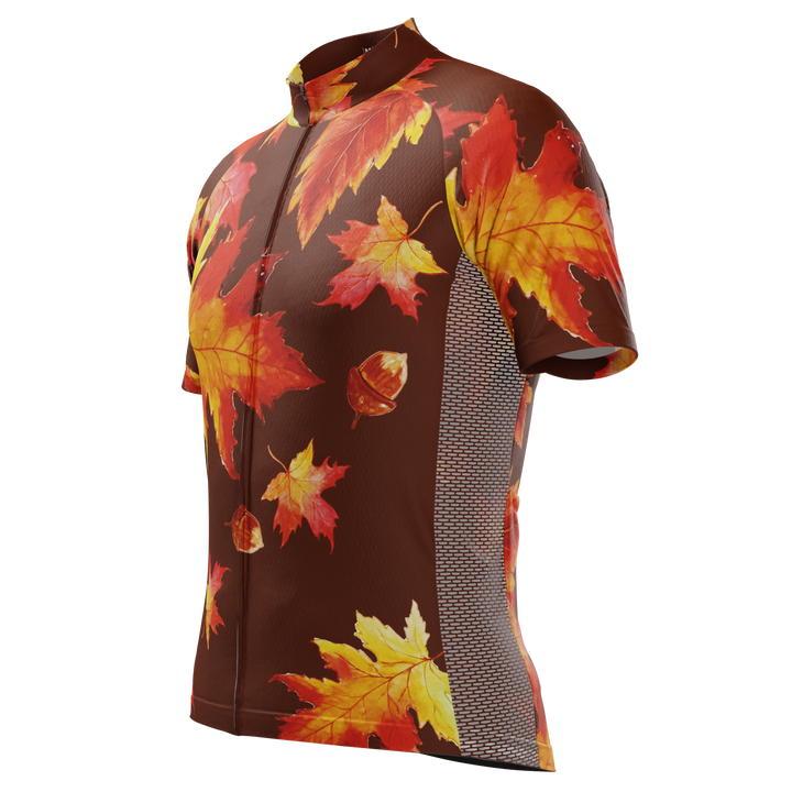 The Men's Autumn Acorns Short Sleeve Cycling Jersey features a moisture-wicking LEMBO 140 GSM polyester, cooling 110GSM mesh side panels, and reinforced stitched back pockets.