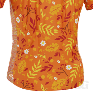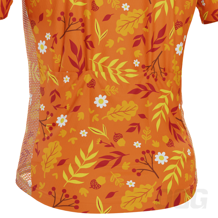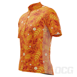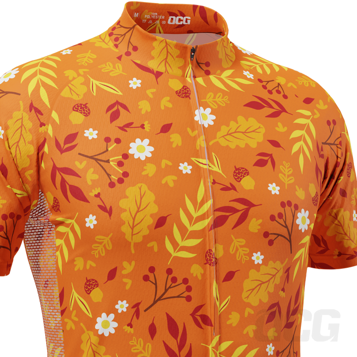 The Men's Autumn Leaves Bright Short Sleeve Cycling Jersey features a moisture-wicking LEMBO 140 GSM polyester, cooling 110GSM mesh side panels, and reinforced stitched back pockets.