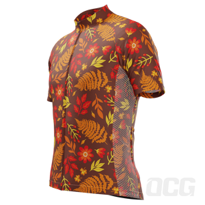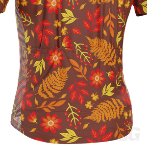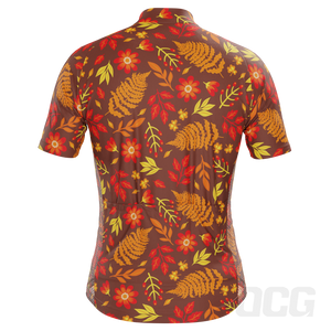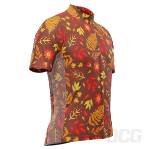 The Men's Autumn Leaves Dark Short Sleeve Cycling Jersey features a moisture-wicking LEMBO 140 GSM polyester, cooling 110GSM mesh side panels, and reinforced stitched back pockets.