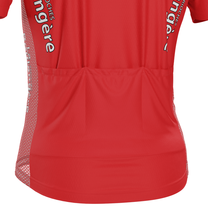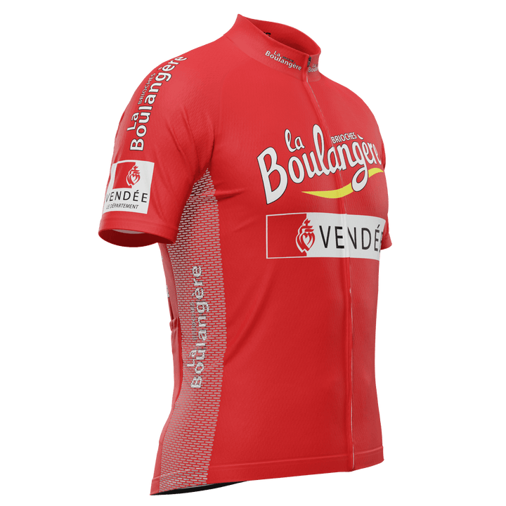 The Men's Baker Short Sleeve Cycling Jersey features a moisture-wicking LEMBO 140 GSM polyester, cooling 110GSM mesh side panels, and reinforced stitched back pockets.