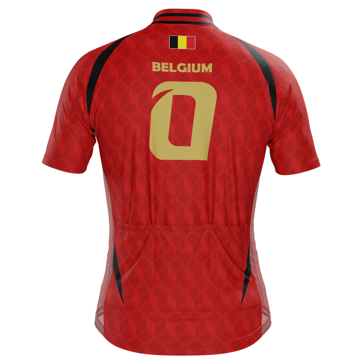 The Men's Belgium Soccer Short Sleeve Cycling Jersey features a moisture-wicking LEMBO 140 GSM polyester, cooling 110GSM mesh side panels, and reinforced stitched back pockets.