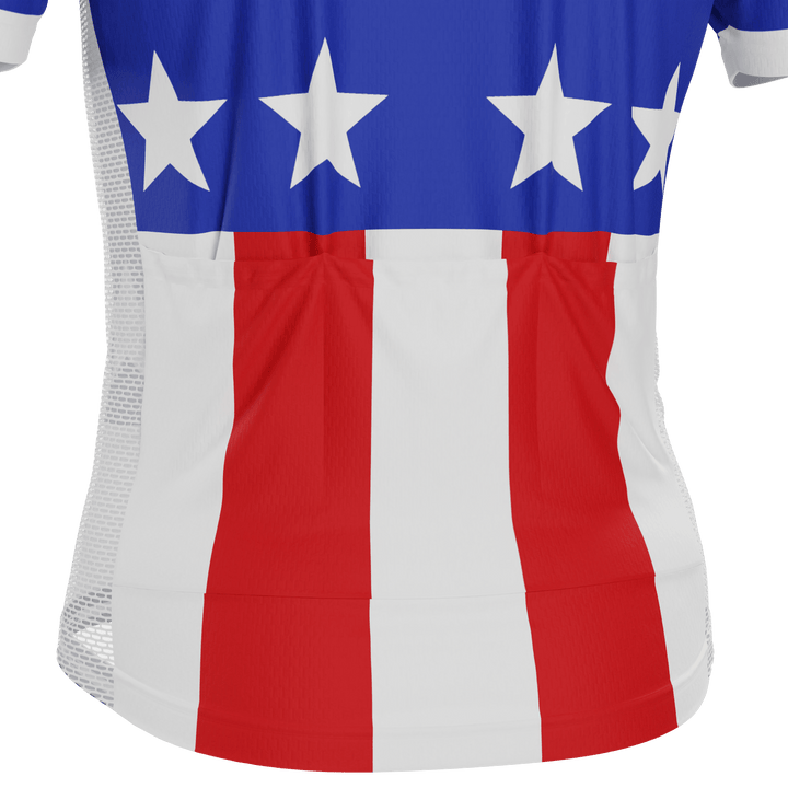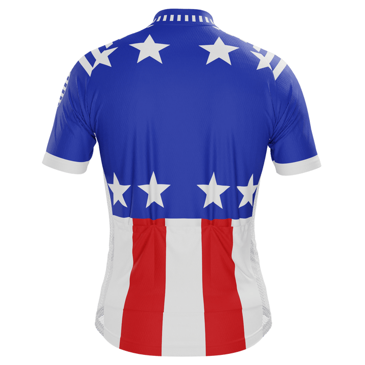 The Men's Blue Americas Short Sleeve Cycling Jersey features a moisture-wicking LEMBO 140 GSM polyester, cooling 110GSM mesh side panels, and reinforced stitched back pockets.