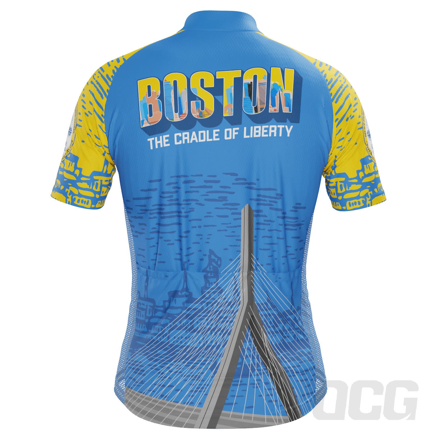 The Men's Boston Short Sleeve Cycling Jersey features a moisture-wicking LEMBO 140 GSM polyester, cooling 110GSM mesh side panels, and reinforced stitched back pockets.