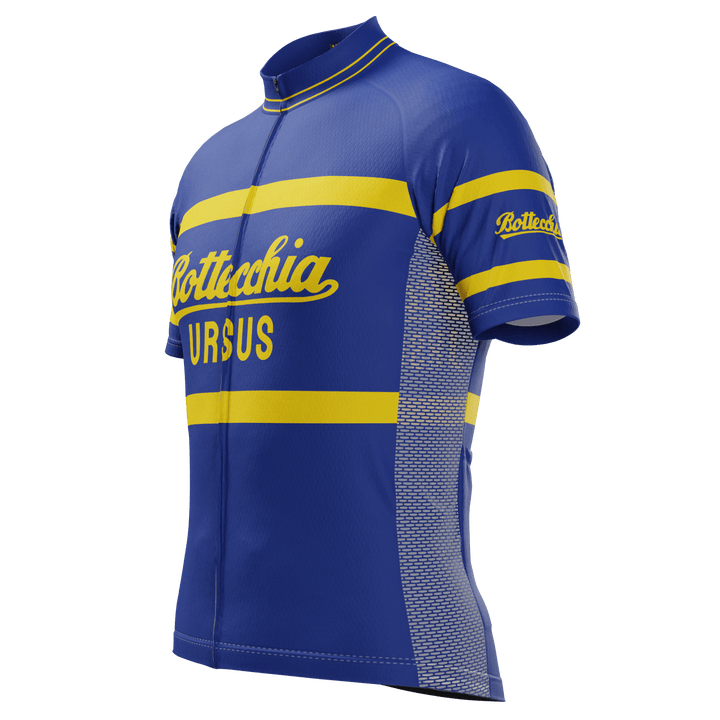 The Men's Bottecchia Ursus Short Sleeve Cycling Jersey features a moisture-wicking LEMBO 140 GSM polyester, cooling 110GSM mesh side panels, and reinforced stitched back pockets.