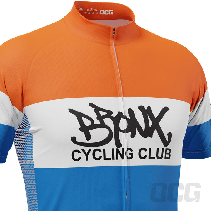 The Men's Bronx Cycling Club Short Sleeve Cycling Jersey features a moisture-wicking LEMBO 140 GSM polyester, cooling 110GSM mesh side panels, and reinforced stitched back pockets.