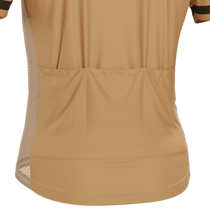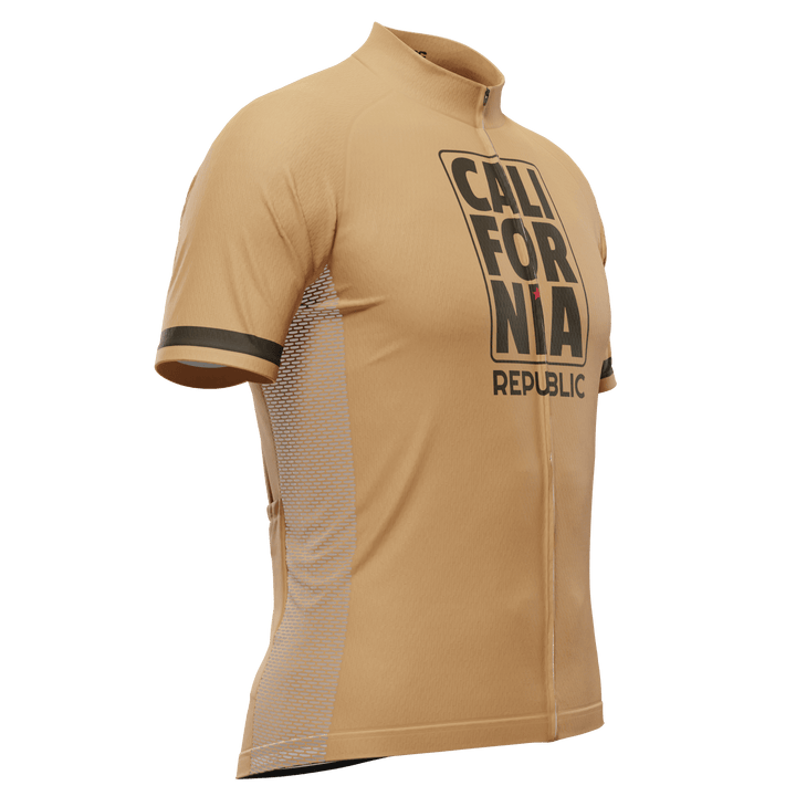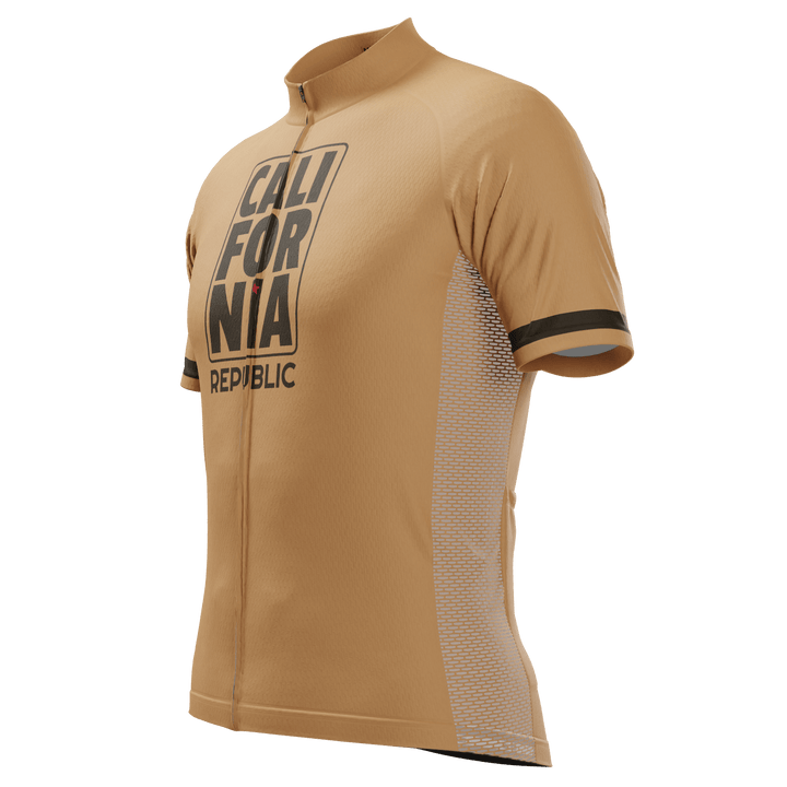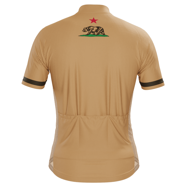 The Men's California Republic Brown Short Sleeve Cycling Jersey features a moisture-wicking LEMBO 140 GSM polyester, cooling 110GSM mesh side panels, and reinforced stitched back pockets.