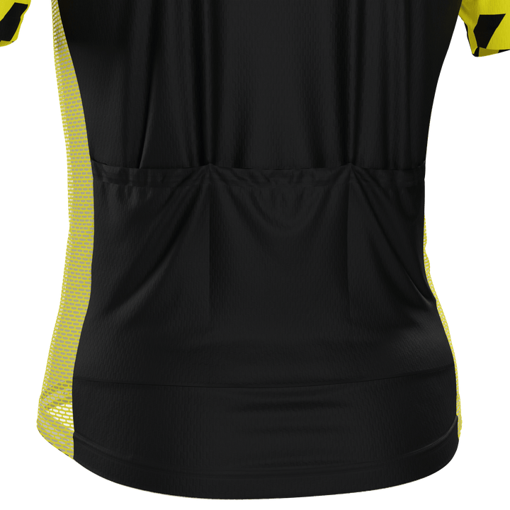The Men's Call Out Your Pass Short Sleeve Cycling Jersey features a moisture-wicking LEMBO 140 GSM polyester, cooling 110GSM mesh side panels, and reinforced stitched back pockets.