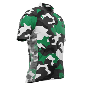 The Men's Camouflage Winter Green Short Sleeve Cycling Jersey features a moisture-wicking LEMBO 140 GSM polyester, cooling 110GSM mesh side panels, and reinforced stitched back pockets.