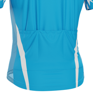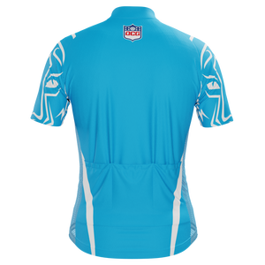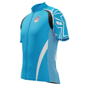 The Men's Carolina Football Short Sleeve Cycling Jersey features a moisture-wicking LEMBO 140 GSM polyester, cooling 110GSM mesh side panels, and reinforced stitched back pockets.