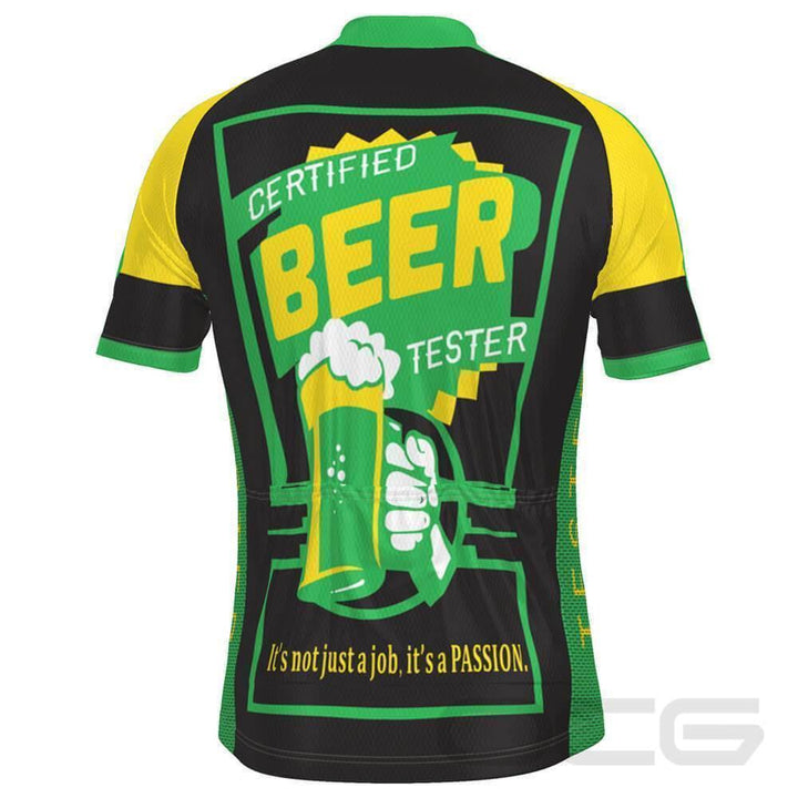 The Men's Certified Beer Tester Short Sleeve Cycling Jersey features a moisture-wicking LEMBO 140 GSM polyester, cooling 110GSM mesh side panels, and reinforced stitched back pockets.