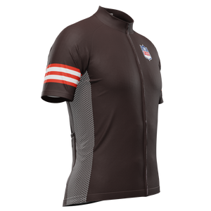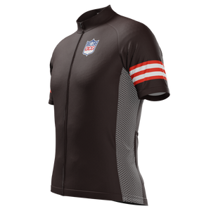 The Men's Cleveland Football Short Sleeve Cycling Jersey features a moisture-wicking LEMBO 140 GSM polyester, cooling 110GSM mesh side panels, and reinforced stitched back pockets.