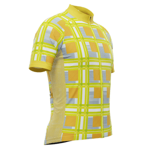 The Men's Criss-Crossed Tartan Short Sleeve Cycling Jersey features a moisture-wicking LEMBO 140 GSM polyester, cooling 110GSM mesh side panels, and reinforced stitched back pockets.