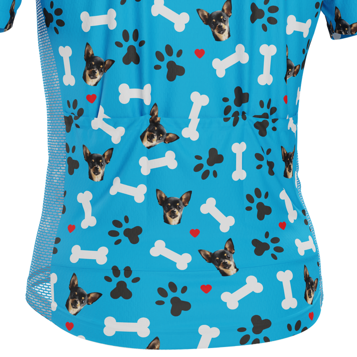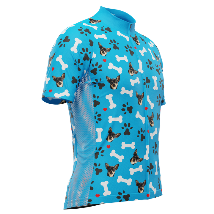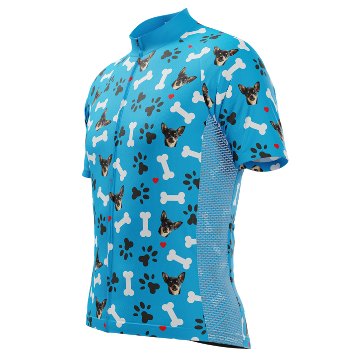The Men's Custom Pet Bones Design Personalized Short-Sleeve Cycling Jersey features a moisture-wicking LEMBO 140 GSM polyester, cooling 110GSM mesh side panels, and reinforced stitched back pockets.