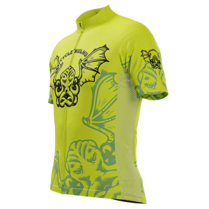 The Men's Cyclethulhu Short Sleeve Cycling Jersey features a moisture-wicking LEMBO 140 GSM polyester, cooling 110GSM mesh side panels, and reinforced stitched back pockets.