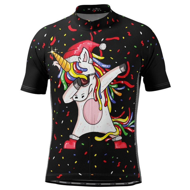 The Men's Dabbing Santa Unicorn Short Sleeve Cycling Jersey features a moisture-wicking LEMBO 140 GSM polyester, cooling 110GSM mesh side panels, and reinforced stitched back pockets.