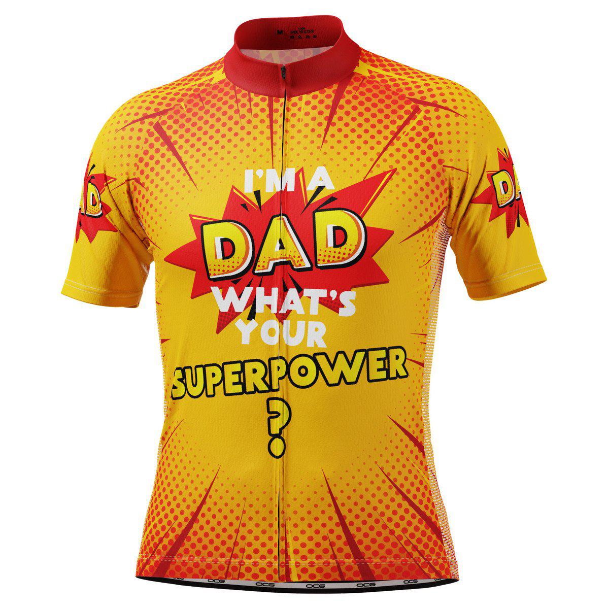 The Men's Dad Superpowers Short Sleeve Cycling Jersey features a moisture-wicking LEMBO 140 GSM polyester, cooling 110GSM mesh side panels, and reinforced stitched back pockets.