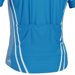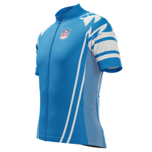 The Men's Detroit Football Short Sleeve Cycling Jersey features a moisture-wicking LEMBO 140 GSM polyester, cooling 110GSM mesh side panels, and reinforced stitched back pockets.