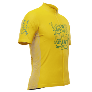 The Men's Don't Be Afraid To Be Great Short Sleeve Cycling Jersey features a moisture-wicking LEMBO 140 GSM polyester, cooling 110GSM mesh side panels, and reinforced stitched back pockets.