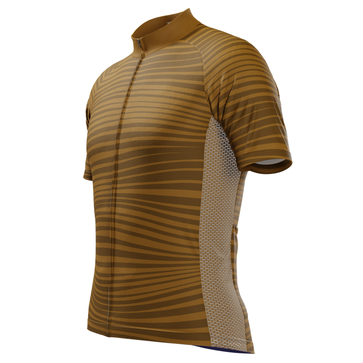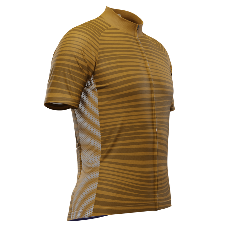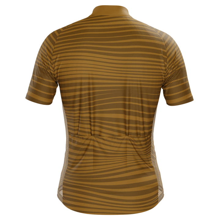 The Men's Earthbound Stripes Short Sleeve Cycling Jersey features a moisture-wicking LEMBO 140 GSM polyester, cooling 110GSM mesh side panels, and reinforced stitched back pockets.