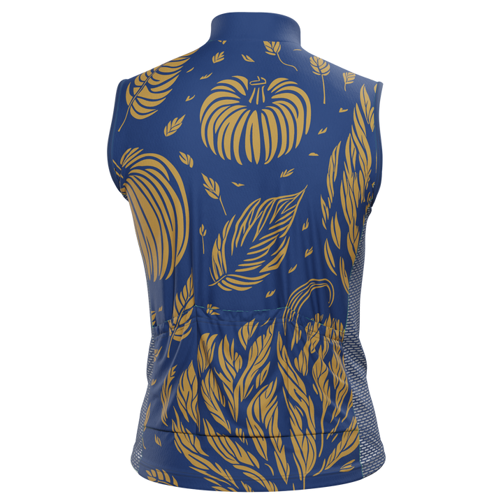 The Men's Fall Pumpkins Sleeveless Cycling Jersey features a moisture-wicking LEMBO 140 GSM polyester, cooling 110GSM mesh side panels, and reinforced stitched back pockets.