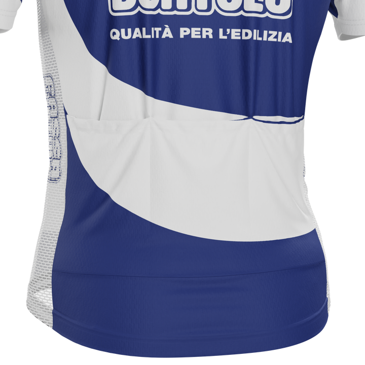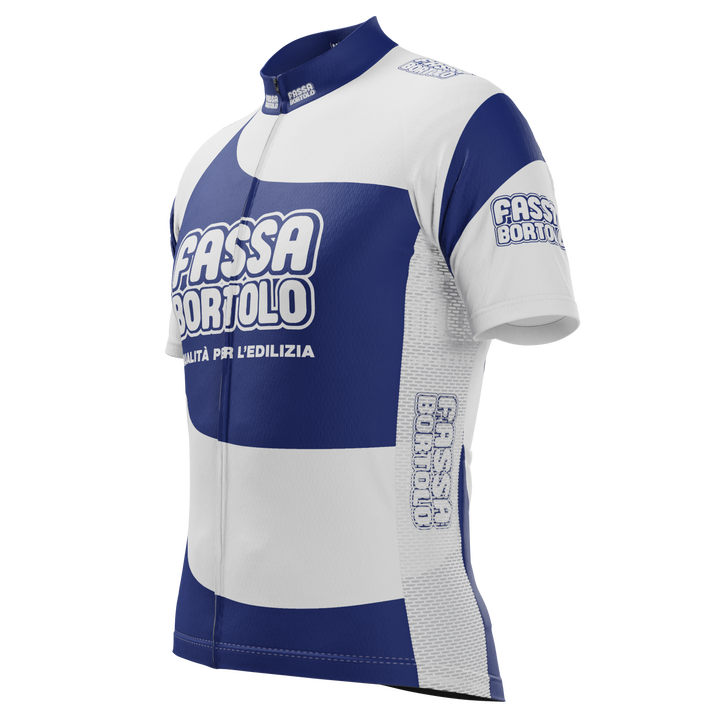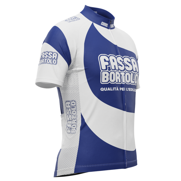 The Men's Fassa Bartolo Short Sleeve Cycling Jersey features a moisture-wicking LEMBO 140 GSM polyester, cooling 110GSM mesh side panels, and reinforced stitched back pockets.