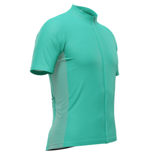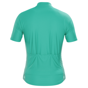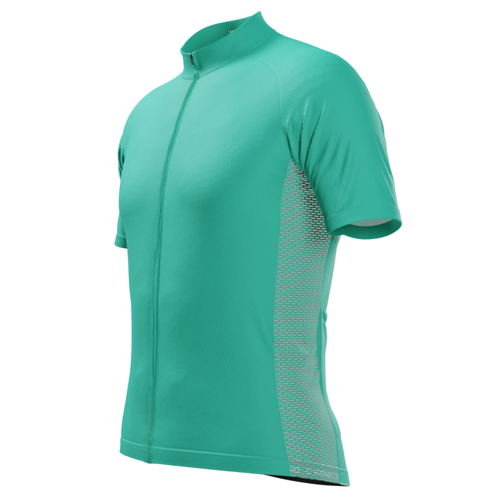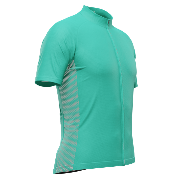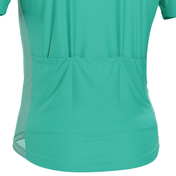 The Men's Forest Matte Colors Short Sleeve Cycling Jersey features a moisture-wicking LEMBO 140 GSM polyester, cooling 110GSM mesh side panels, and reinforced stitched back pockets.