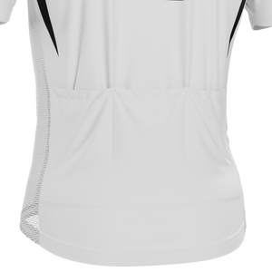 The Men's Germany Soccer Short Sleeve Cycling Jersey features a moisture-wicking LEMBO 140 GSM polyester, cooling 110GSM mesh side panels, and reinforced stitched back pockets.