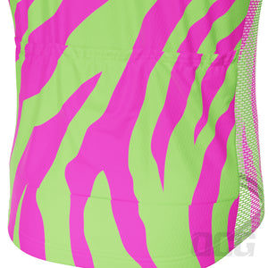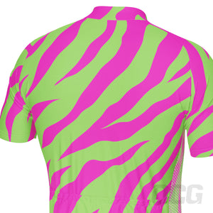 The Men's Green & Pink Tiger Short Sleeve Cycling Kit features a moisture-wicking LEMBO 140 GSM polyester jersey body, cooling 110GSM mesh side panels, and reinforced stitched back pockets.