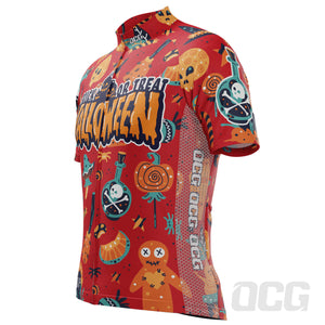 The Men's Halloween Trick or Treat Short Sleeve Cycling Jersey features a moisture-wicking LEMBO 140 GSM polyester, cooling 110GSM mesh side panels, and reinforced stitched back pockets.