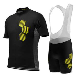 The Men's Hexagon Short Sleeve Cycling Kit features a moisture-wicking LEMBO 140 GSM polyester jersey body, cooling 110GSM mesh side panels, and reinforced stitched back pockets.