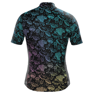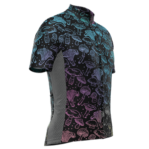 The Men's Holographic Mushrooms Short Sleeve Cycling Jersey features a moisture-wicking LEMBO 140 GSM polyester, cooling 110GSM mesh side panels, and reinforced stitched back pockets.